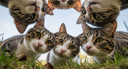 group of cat in a row on green grass, focus on eyes