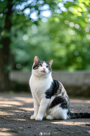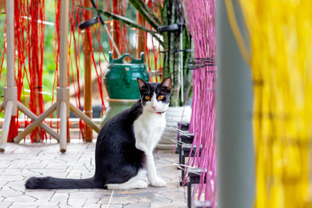 Black and white cat sitting on the floor in the garden, Thailand.