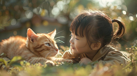 A girl stroking the head of a beautiful stray cat