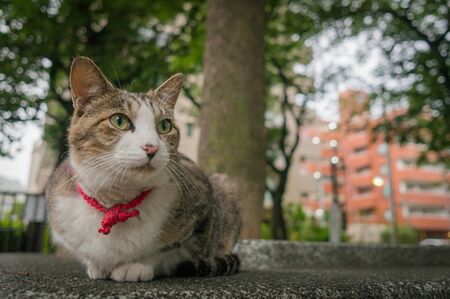 Tricolor cat sitting on the road in the city. Animal portrait