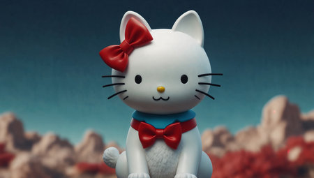 Cute cartoon cat with red bow and collar in fantasy landscape background.