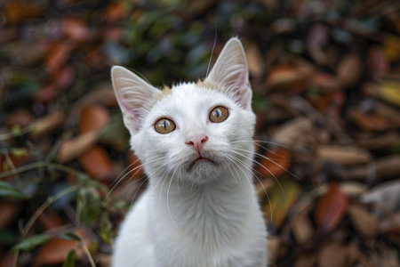 White cat with yellow eyes on autumn leaves background. Close up.