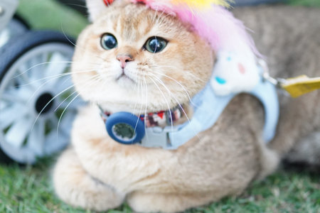 A charming cat sits gracefully on green grass, adorned with a colorful headband and harness, showcasing a playful and curious personality in a vibrant outdoor setting.