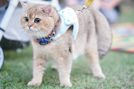 A little cat in harness walks outdoors. American Shorthair wearing vest looks at camera.