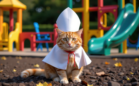A regal cat dressed as a pope, complete with a white papal hat, cape, and a cross necklace, sitting on a sunny day.