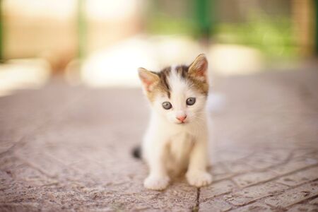 white kitten sitting in the yard on a stone floor, portrait of a cute little cat