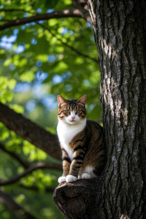 A black, white, and orange cat sitting on a tree branch. Generative AI image.