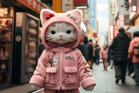 An AI generated illustration of a friendly cartoon cat in a pink outfit standing on the pavement