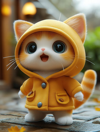 This charming image features a playful kitten dressed in a bright yellow raincoat and matching hat, holding a tiny umbrella. The adorable pet showcases a joyful expression while standing outdoors, capturing a delightful moment filled with cuteness and whimsy. Perfect for conveying themes of fun and companionship in pet photography.