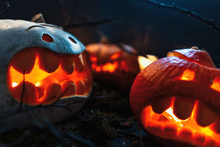 Closeup of scary Halloween Pumpkin In A Mystic Forest At Night. Halloween day.