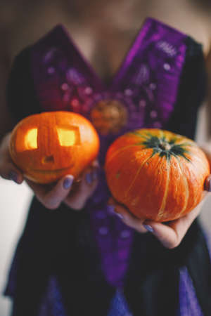 Close-up of female hands on a pumpkin for halloween in a dark studio. The witch is holding a jack-o-lantern