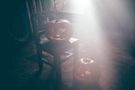 Pumpkins with carved grimaces and candles inside in the dark for halloween. Jack o latern in smoke.