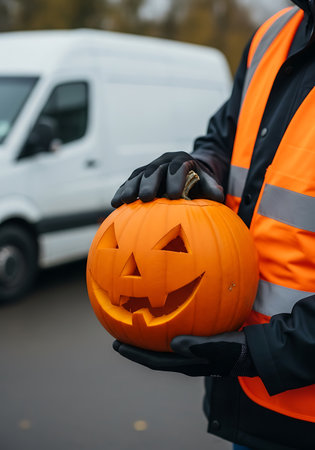 A person wearing black gloves and an orange reflective vest holds a carved orange pumpkin. The pumpkin has a traditional jack-o'-lantern face with triangular eyes and a jagged mouth. In the blurred background, a white delivery van is visible on an asphalt surface. The scene appears to be outdoors during the daytime.