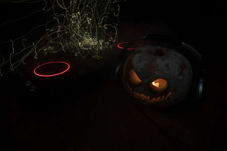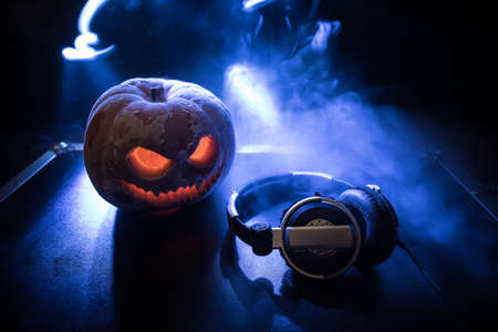 Halloween pumpkin on a dj table with headphones on dark background with copy space. Happy Halloween festival decorations and music concept