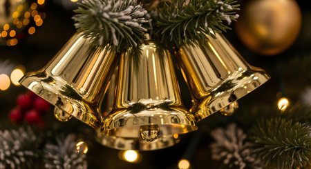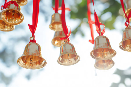 Golden bells hanging with red ribbons on a tree branch, creating a festive atmosphere