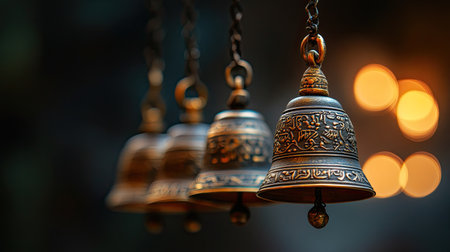 Captivating image of golden bells hanging against a serene sunrise, reflecting beauty and tranquility in a tranquil outdoor setting. Perfect for travel and cultural themes.