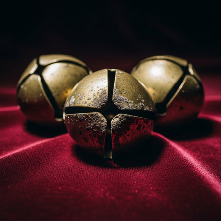Close-up view of decorative golden bells featuring intricate designs scattered on a sparkling black surface. Ideal for festive celebrations and holiday decorations.