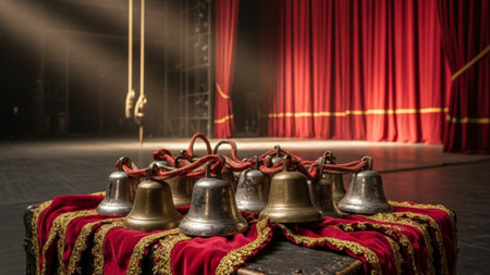 The dark background accentuates the elegance of the vintage hand bell. Creating using generative AI tools
