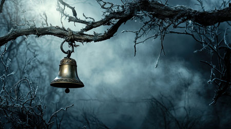 A rustic bell hangs from a gnarled tree branch, surrounded by a foggy forest at dusk, creating an eerie and mysterious atmosphere.