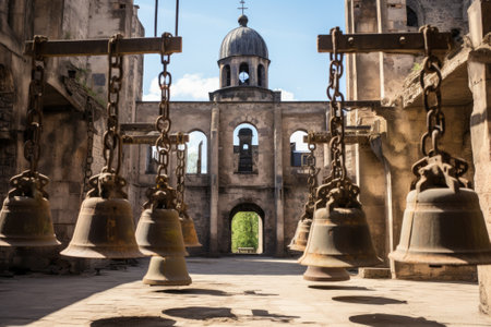 Ancient metal bell hanging, meditating in foreground generated by artificial intelligence
