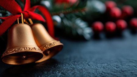 Golden bells hanging against copy space background. Bells are in focus, with their intricate details. Image evokes a sense of celebration and festivity, making it perfect for holiday-themed projects