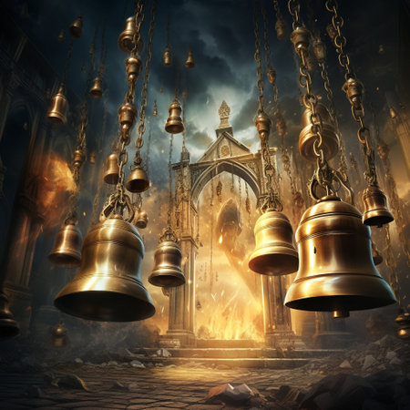 A bell is suspended from a wall with a blue background. The bell is surrounded by a lot of debris, giving the impression of a broken or destroyed environment. Concept of chaos and destruction