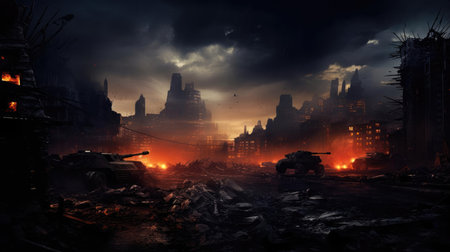 Nuclear war apocalypse concept. Explosion of nuclear bomb in city. City destroyed by atomic war. Creative artwork decoration in dark. Selective focus