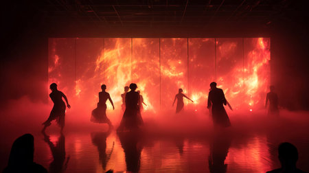 Dancers are performing on stage with vibrant lighting and fog, creating a mesmerizing ambiance that enhances the emotional impact of the dance performance, AI generated