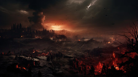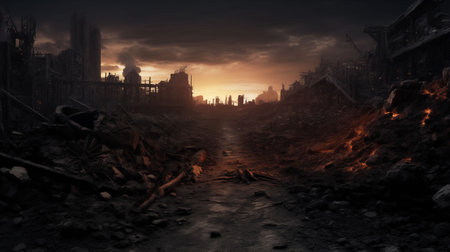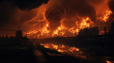 Huge fire destroying buildings in war torn city, creating apocalyptic scene with intense flames and thick smoke filling the sky during sunset