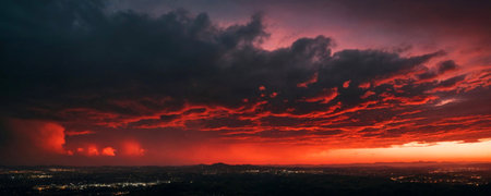 A panoramic view of a sky in rich red tones stretches over a cityscape, creating a dramatic and vibrant backdrop. The intense red hues contrast strikingly with the urban environment below, making it ideal for use in urban, travel, and dramatic-themed projects.