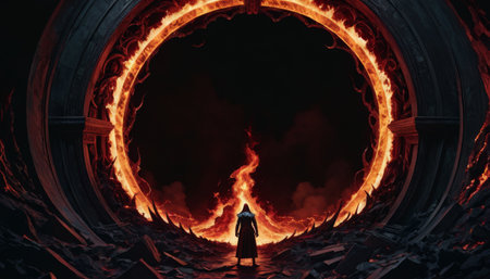 In a desolate landscape of ruins, a solitary figure stands before a towering fiery portal, a symbol of untold power and mystery.. AI Generation