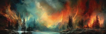 A captivating image of a stormy night sky, with a vibrant, fiery cloud formation illuminating the scene, framed by dark silhouettes of trees.