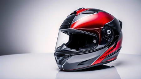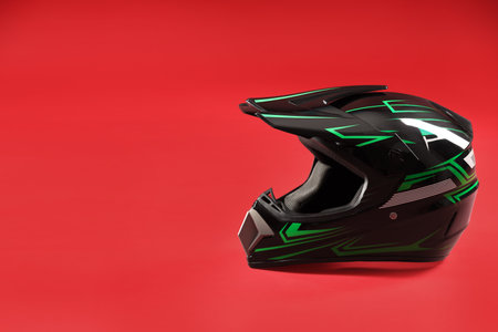 Modern motorcycle helmet with visor on red background. Space for text