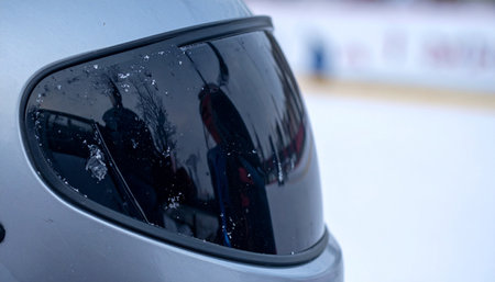 Realistic macro close-up of bobsleigh helmet dark visor showing frost detail and subtle snowy track reflection, minimal winter sports equipment concept, no humans, no text.