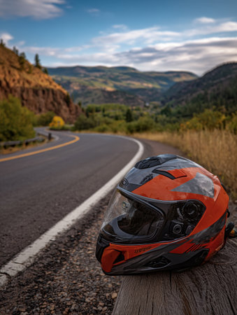 A bright motorcycle helmet sits on a wooden bench next to a scenic, winding road surrounded by lush green hills and a cloudy sky during daylight.