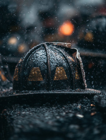 A firefighter helmet is placed on the wet ground, covered in ash, as rain falls around it. Blurred warm lights indicate ongoing firefighting activities nearby.