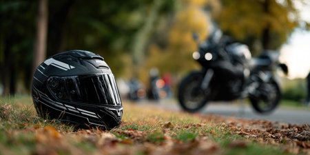 Environmental Reservation Motorcycle, Biker riding gloves and helmet on fallen leaves over grass background. Automne.