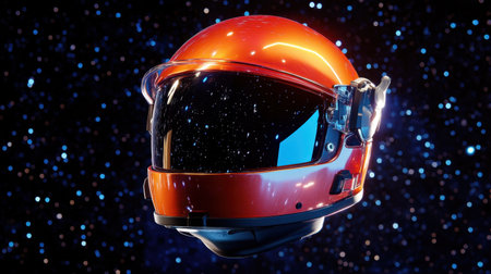A striking futuristic red space helmet set against a mesmerizing cosmic background filled with stars, perfect for themes of exploration and adventure.