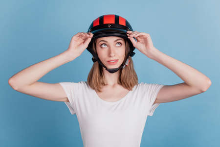 Portrait of curious dreamy lady wear motorcycle helmet look empty space on blue background