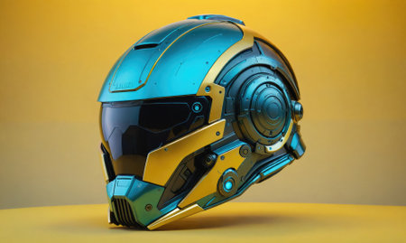 A futuristic helmet with a blue and gold design sits on a yellow surface