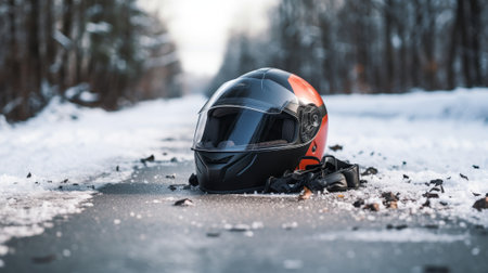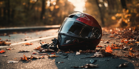 Photo of helmet and motorcycle on road, the concept of road accidents. Generative AI