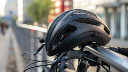 A black bicycle helmet rests on a metal railing in an urban setting. The background features blurred buildings and greenery, suggesting a city environment.