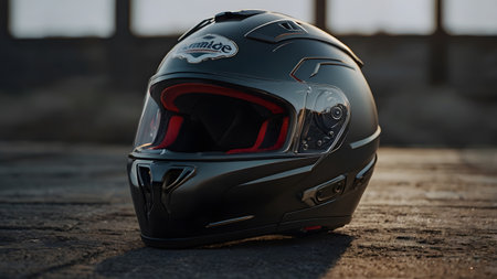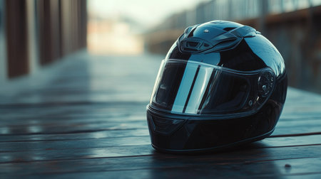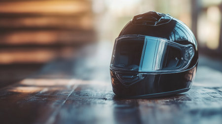 A shiny black motorcycle helmet placed on a wooden table, symbolizing adventure and thrill with a focus on safety