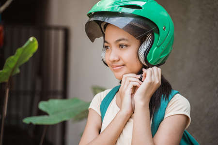 closeup beautiful young girl standing wearing tshirt bag and helmet