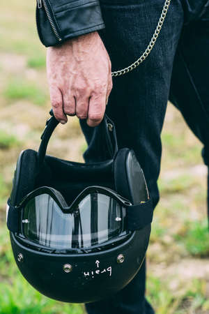 Hand of male motorcyclist holding black crash helmet
