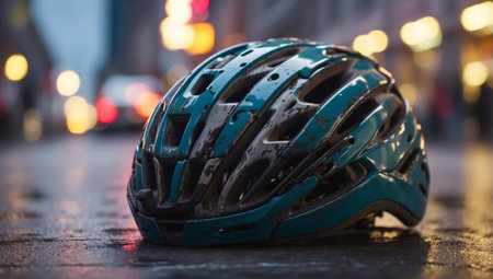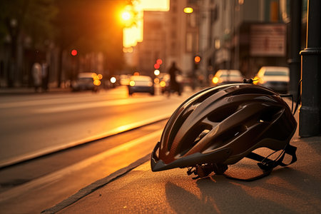 AI Generated. Close up of bicycle helmet on city street pavement after automobile accident scene