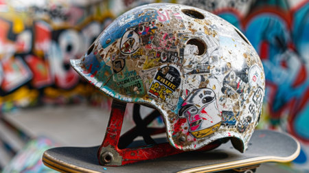 Old and used helmet covered with stickers resting on skateboard