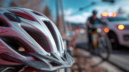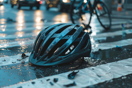 Close up of bicycle helmet and bike on urban street following automobile collision accident
