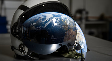 A pilot or astronaut helmet rests on a surface in a workshop, with a stunningly clear and detailed reflection of planet Earth on its dark visor. The image evokes themes of space exploration, environmental awareness, and the dream of flight.