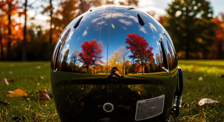 A shiny, black American football helmet rests on a grassy field, its curved surface creating a perfect, wide-angle reflection of a beautiful park in peak autumn season. The vibrant red and yellow trees and blue sky are captured in this creative and artistic image that blends sports with nature.